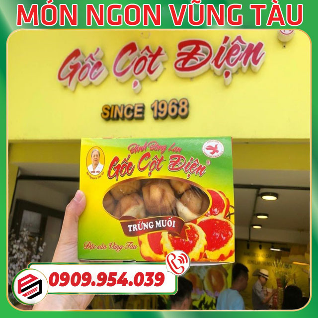Tọa lạc tại số 17B Nguyễn Trường Tộ, P.2, TP.Vũng Tàu, có mặt lần đầu tiên tại Vũng Tàu từ năm 1968, đến nay cơ sở bánh bông lan trứng muối Gốc Cột Điện đã hoạt động được 57 năm và vẫn giữ được hương vị thơm ngon như thuở ban đầu. Bánh bông lan trứng muối tại đây nổi tiếng với sự kết hợp hoàn hảo giữa vị ngọt béo của bánh bông lan mềm mịn và vị mặn bùi của trứng muối. Lớp sốt phô mai hoặc chà bông giúp tăng thêm hương vị, tạo nên sự cân bằng giữa ngọt và mặn. Khi cắn vào, bánh tan ngay trong miệng, trứng muối bùi bùi hòa quyện với sốt béo ngậy, mang đến cảm giác vừa lạ miệng vừa gây nghiện.