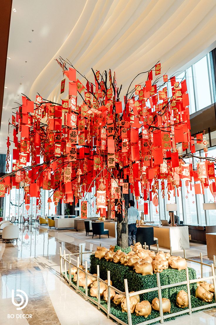 Các cành hoa nên được đặt ở trung tâm của gian hàng hoặc các góc trang trí nổi bật để thu hút mọi ánh nhìn. Các bạn có thể kết hợp gắn các đèn LED nhỏ vào các cành hoa để tạo hiệu ứng lung linh, rực rỡ hơn cho các cành hoa.